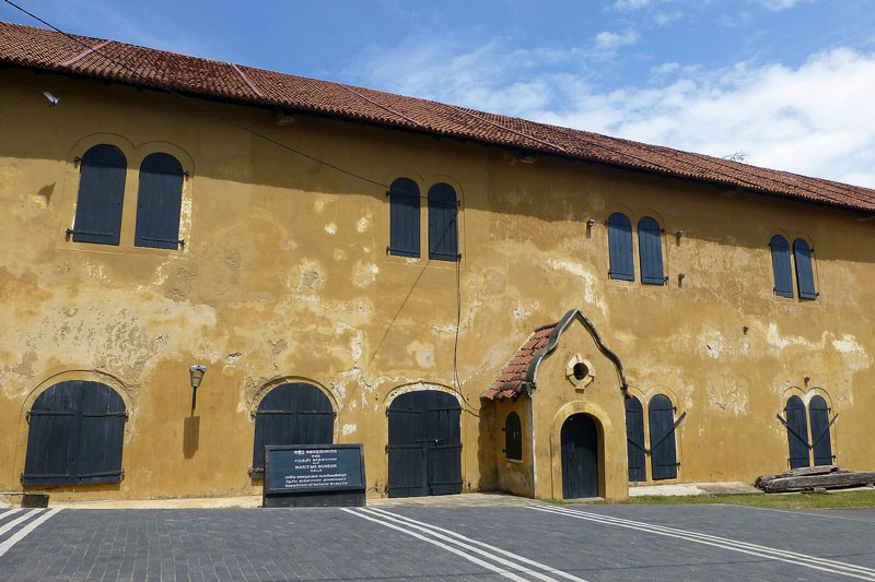 Opened to public on May 9, 1992, the National Maritime Museum in Galle is located within the Dutch Warehouse building, which itself was constructed in 1671. The warehouse is a long two-storied building and served as an entrance to the fort. Over the centuries, the building served various purposes including that of an complex that housed government offices. This was one of the few buildings that survived the impact of the 2004 tsunami even though most of the artifacts were lost. It took three years of reconstruction and help from the Netherlands before it was back in business. Today, it exhibits over hundreds of artifacts discovered around the coast of Galle such as maps, naval crafts, barrels, ropes, smoking pipes, sailor shoes and guns retrieved from the Dutch East India company that sank into the the sea in 1659.